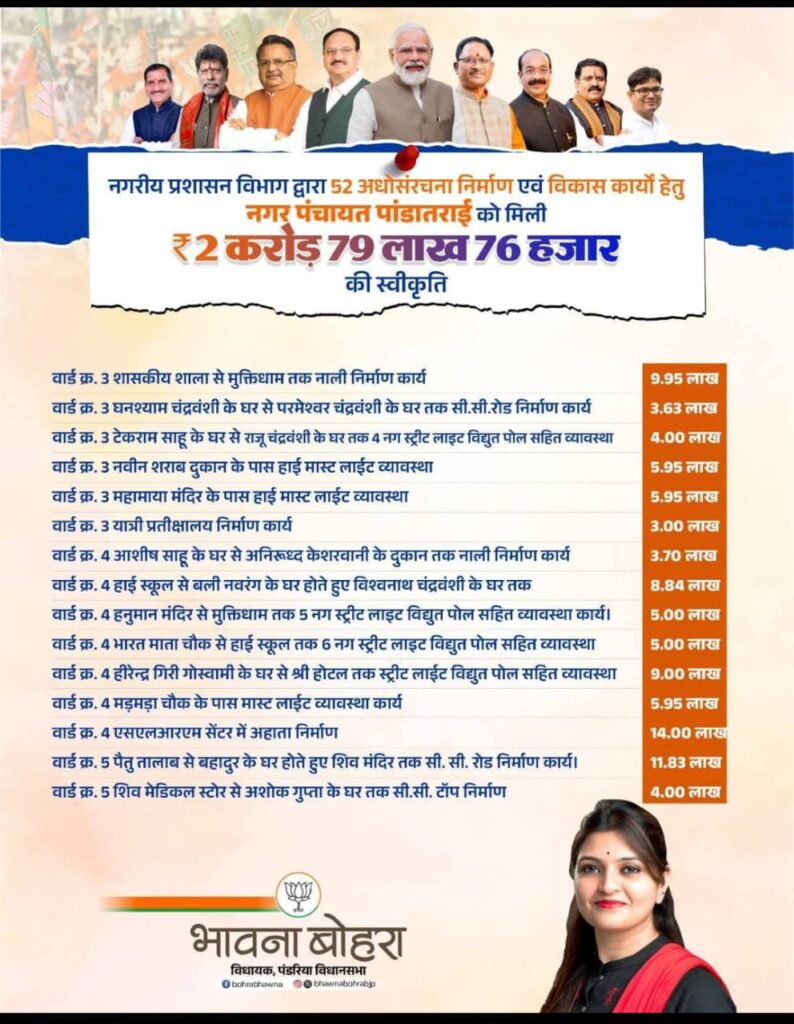 पंडरिया विधायक भावना बोहरा के प्रयासों से नगर पंचायत पांडातराई को ₹2.79 करोड़ के 52 विकास कार्यों की सौगात