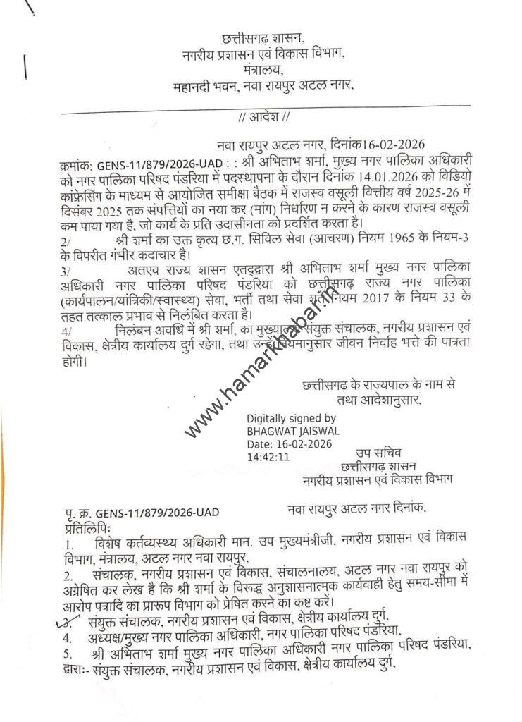 छत्तीसगढ़ शासन के नगरीय प्रशासन एवं विकास विभाग ने पंडरिया नगर पालिका परिषद के मुख्य नगर पालिका अधिकारी (CMO) अभिताभ शर्मा को तत्काल प्रभाव से निलंबित कर दिया है। यह कार्रवाई राजस्व वसूली में लापरवाही को लेकर की गई है।