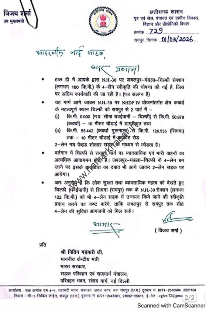 उन्होंने पत्र में बताया था कि हाल ही में जबलपुर–मंडला–चिल्फी सेक्शन (लगभग 160 किमी) को 4-लेन किए जाने की घोषणा की गई है। ऐसे में चिल्फी (धरईपानी) से सिमगा (रायपुर) तक लगभग 122 किमी के शेष हिस्से को भी 4-लेन में उन्नयन की स्वीकृति दी जानी आवश्यक है, ताकि जबलपुर से रायपुर तक सीधी और सुगम 4-लेन कनेक्टिविटी उपलब्ध हो सके।